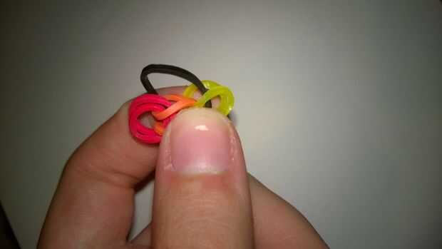 este es mi primer insuperable así que por favor comentario y dígame de lo trabajadoPaso 1: Cómo hacer una pulsera de goma sin telar Artículos:Bandas de gomaClip de S o CGanchoPaso 2: Poner una goma en el dedo y girar como un ocho entonces puso dos má