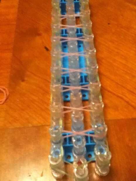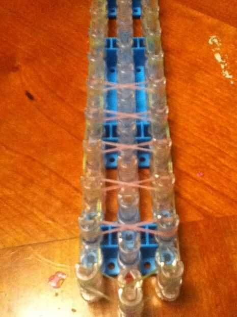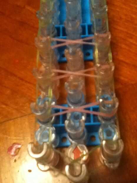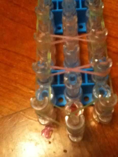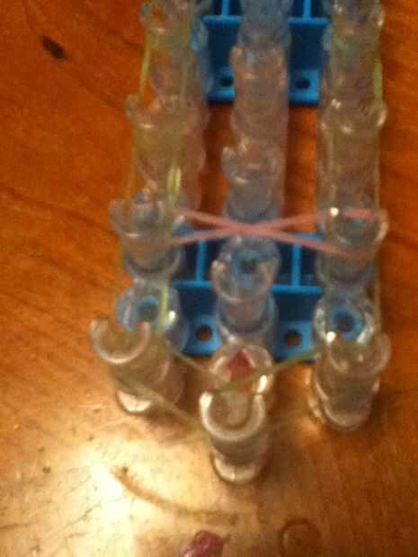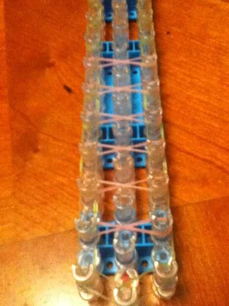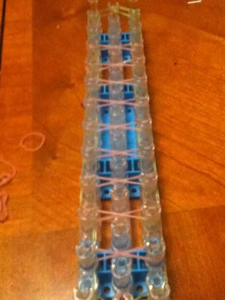 Lugar en la segunda fila luego girar una banda elástica. Subir el telar haciendo esto. Pare en el segundo a último clavijas.