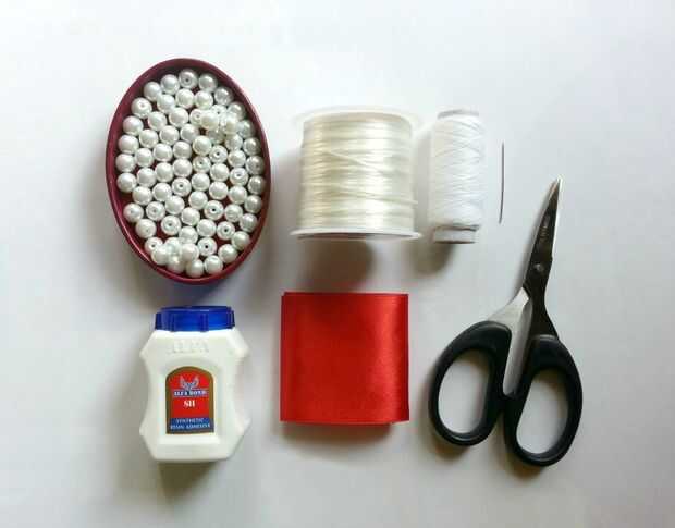 1) perlas, 2) 1 pulgada ancho cinta de raso (cualquier color que desee, he usado rosa, crema, rojo, púrpura) 3) hilo elástico, 4) hilos y el gancho, 5) pegamento blanco, 6) tijera.