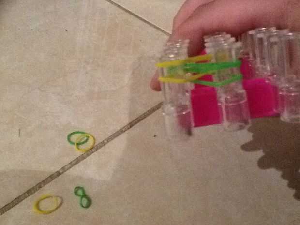 esta es probablemente una de las pulseras más fáciles se puede hacer! Les espero guste!Paso 1: Lo que necesitará 1. un telar2. un gancho3. colores bandasPaso 2: Vamos a empezar! Añadir sólo una cadena de bandas en el centro del telar. Puede utilizar