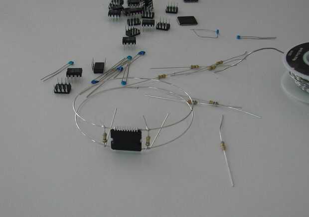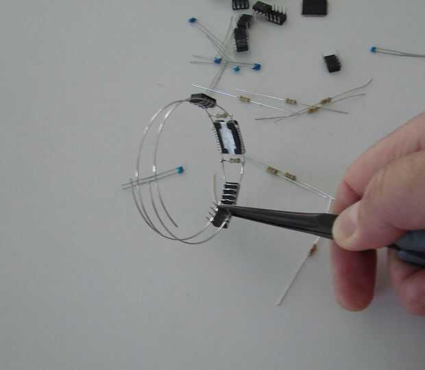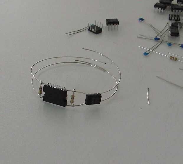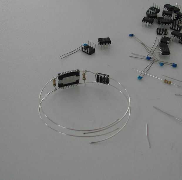 El alambre entonces estaba doblado hacia adentro hasta que para que coincida con el ancho de los 8 pin DIP IC. El alambre de la joyería se utiliza para arriba bajo el IC para que el alambre está entre el cuerpo y los pines del CI. Los alicates de punta larga se utilizan para doblar las piernas sobre el alambre manteniendo el IC conectado al cable.