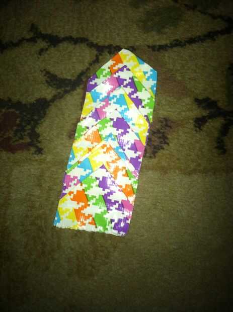 materiales tijeras, cinta aislantePaso 1: El comienzo 2 cortar del mismo tamaño las tiras de cinta de conducto que se forma alrededor de su brazo y les peganPaso 2: doblar Luego tomar un cuadrado de cinta adhesiva y doblar por la mitad dejando un poc