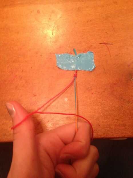 Para comenzar el diseño de la envoltura, tome una cadena a la otra dos. Este será el color que desee mostrar primero. Enrolle la cadena alrededor de su dedo pulgar. (esto se debe ver como un número 4.)