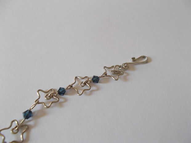 Abra un pequeño lazo en un enlace de cuentas y deslice una estrella en el bucle antes de cerrarlo. Enjuague y repita hasta que todas sus estrellas han sido conectados por la relación de cuentas. Añadir las dos partes de la hebilla a los extremos para terminar esto.