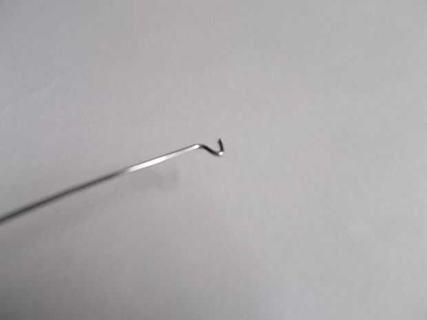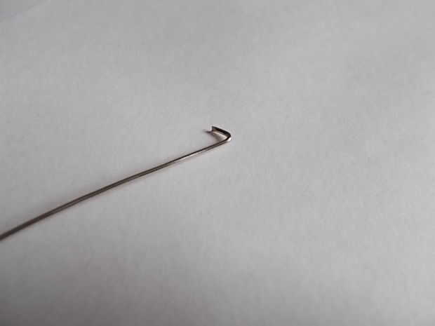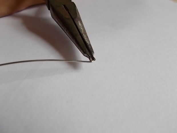 Comience usando sus alicates para hacer una curva pronunciada de unos 3mm desde el extremo del alambre (yo quería que mis estrellas tan pequeñas como sea posible.). Luego realizar otro unos 3mm desde la curva anterior, doblando el camino inverso esta vez (voy a llamar a esto hacia fuera en adelante porque este es "hacia fuera" lejos del centro de la pronto-a-ser-estrella). Debe tener algo que parece un triángulo sin un lado.