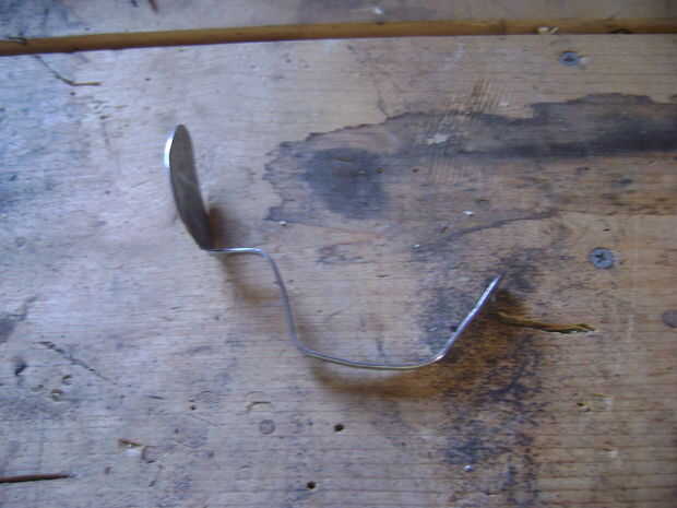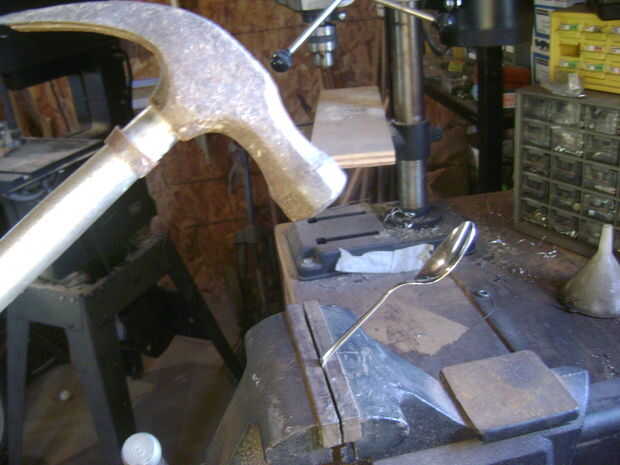 Poner la cuchara en la abrazadera y utilice el hammar para doblarla. Flexión es la parte difícil, tienes que asegúrese de que la cuchara sea en la forma correcta para ir alrededor de su muñeca. Al final podría verse así. No te preocupes si no es así, siempre y cuando su en un óvalo como forma entonces su multa.