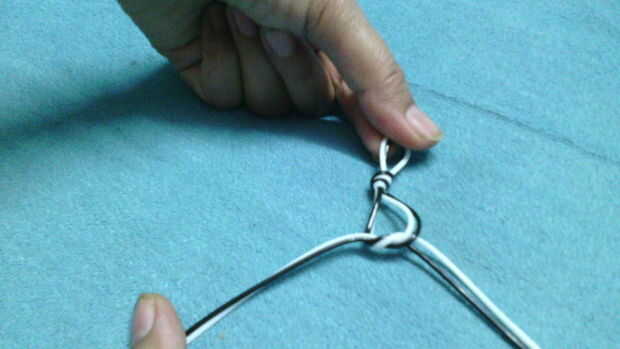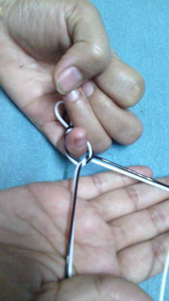 Tomar un espacio de un dedo desde el primer nudo y empezar a atar un nudo de arrecife allí como se muestra.