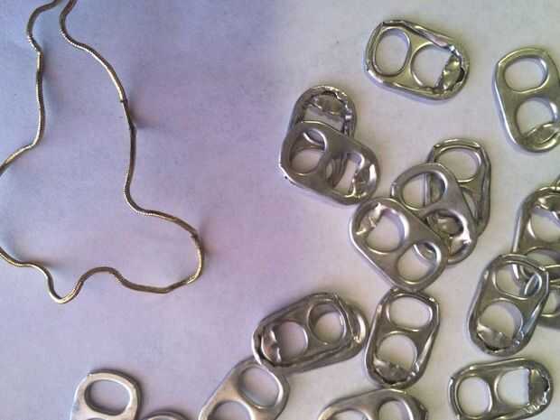 empezar a los contenedores de reciclaje asaltar a!Aluminio de vuelta puede pestañas en joyería cool!Paso 1: Reúna los suministros Para empezar, necesita una pila de fichas pop. Entre 20-26, dependiendo de tamaño de la muñeca.También necesitas tijeras