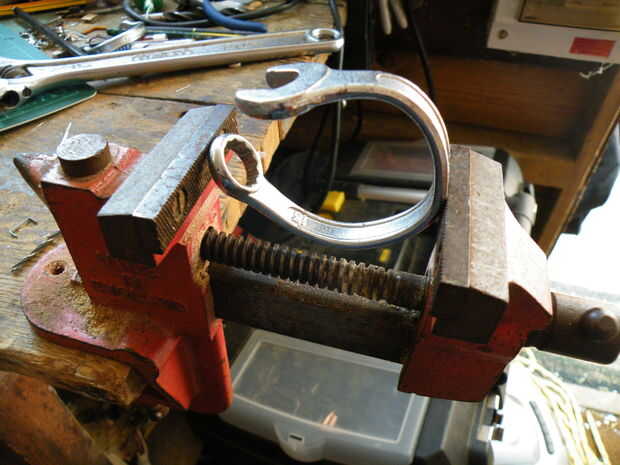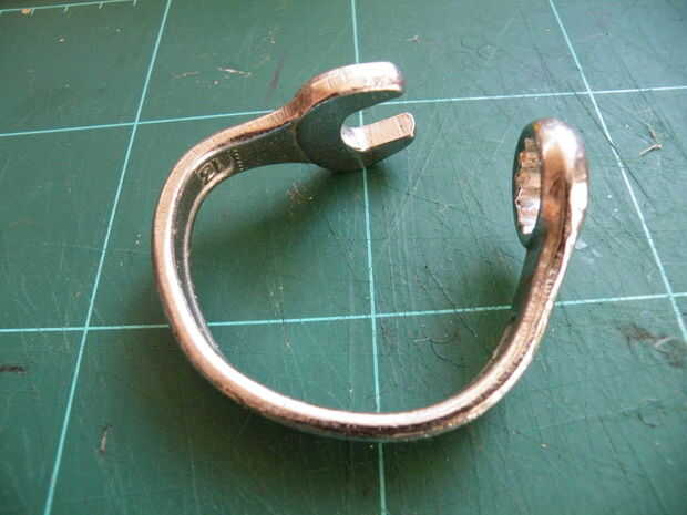Accidentalmente terminó con más de un círculo que quería, pero encontré que poniendo la llave curvada en el vicio, luego cierre lentamente, me dio de la forma oval que estaba buscando.