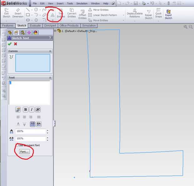 Para la letra L, hacer un dibujo y usar la opción de texto. Tamaño de la L puede determinarse haciendo clic en el botón de 'fuente'. Bajo 'Alturas' eligieron unidades y el tamaño en mm que quiere la carta que. El L debe ser alrededor de 1.5 - 2 veces tan grande como la D. En el cuadro de la versión impresa no es el caso. La cerradura no funciona, así que cambié las medidas en los archivos de SolidWorks.