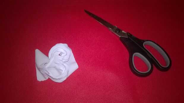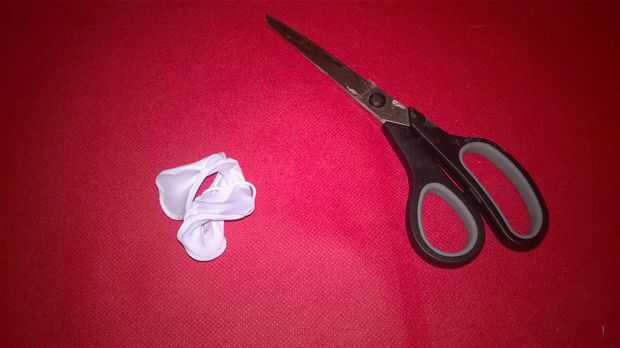 Ahora debemos limpiarlo todo cortando la tela sobrante alrededor de su sorteo para mantener sólo una banda que se envuelva alrededor de su muñeca.