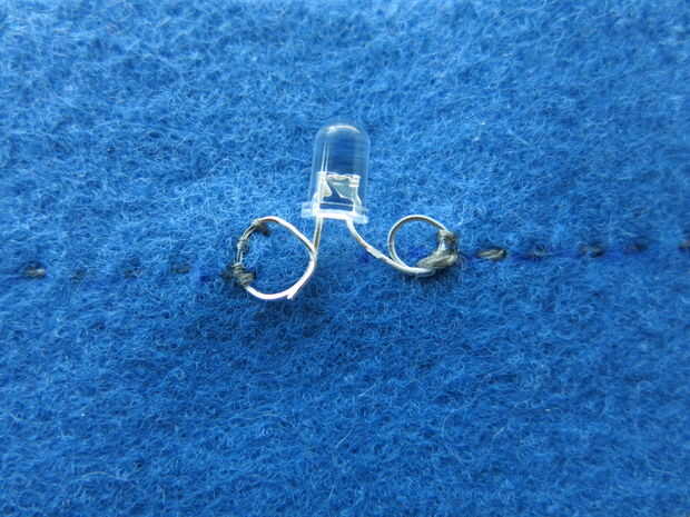 - Coser a través del lazo positivo (+, más grande) del LED tres 3 veces. Nudo y corte el hilo.