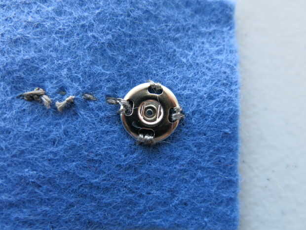 - Coloque el cierre del agujero (adentro) en la parte trasera de fieltro, lejos de usted. El agujero (adentro) en el cierre debe mirar hacia fuera para que el diente del snap (afuera) puede caber en ella.