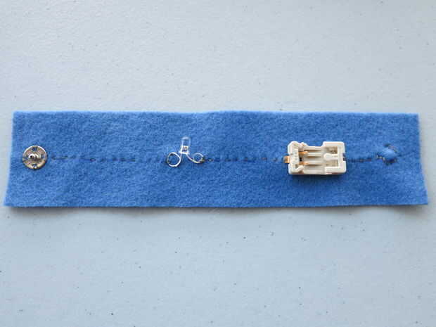 Antes de coser el cierre del agujero (adentro), pruebe la colocación de la pulsera para encontrar la posición de cierre. Marque el punto en la pulsera.