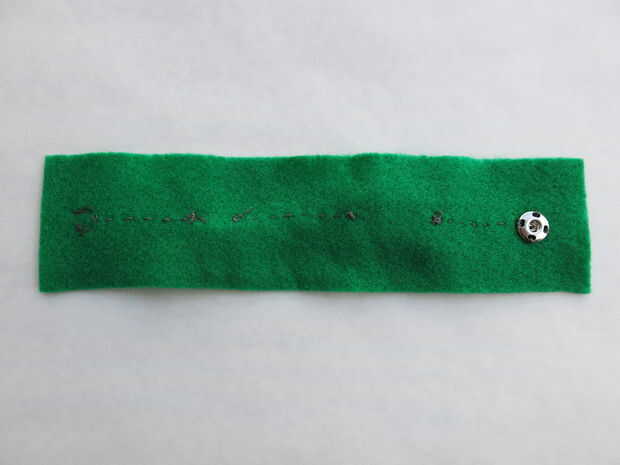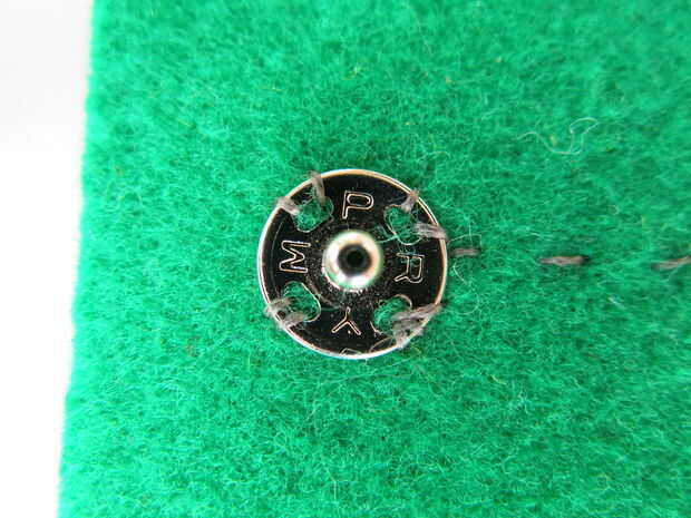 - Coloque el cierre del agujero (adentro) en la parte trasera de fieltro, lejos de usted. El agujero (adentro) en el cierre debe mirar hacia fuera para que el diente del snap (afuera) puede caber en ella.