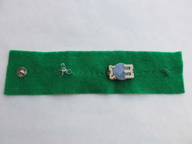 - Coser desde el negativo del LED (- pequeños) lazo para el sostenedor de batería negativo (-, con la ranura) final.