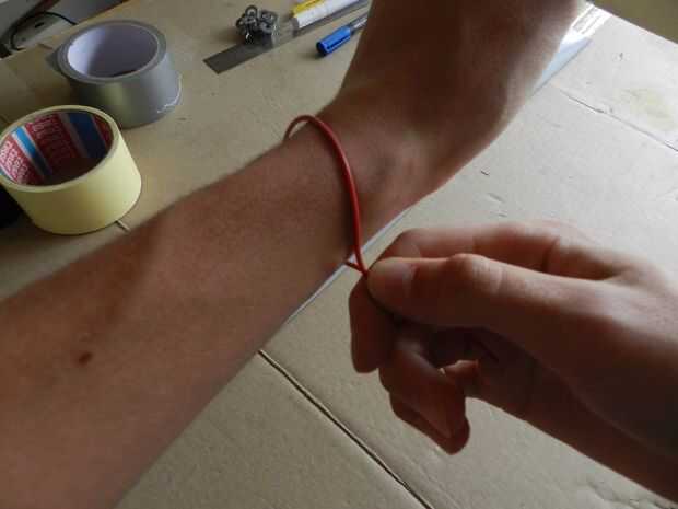 En primer lugar, tenemos que medir el perímetro de la muñeca mediante la cadena de medición, anotar la cifra en centímetros. Luego desenrolla una tira de la cinta del conducto y recomiendo dejar un par de centímetros adicionales en ambos extremos del perímetro muñeca medido y luego doble la marca total.
