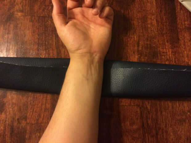 Una vez cortadas, coloque la regla en el extremo perpendicular al brazo (la parte superior o inferior) y doblar hacia adentro utilizando la regla como punto de pivote. La regla es una guía para un mínimo y si quieres una pulsera más amplia puede extender más allá de la regla.
