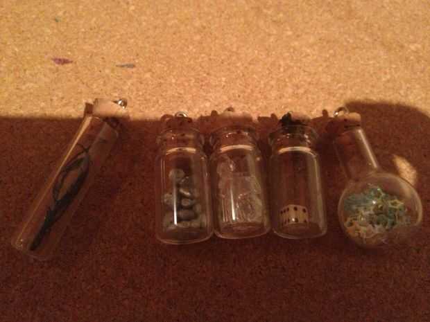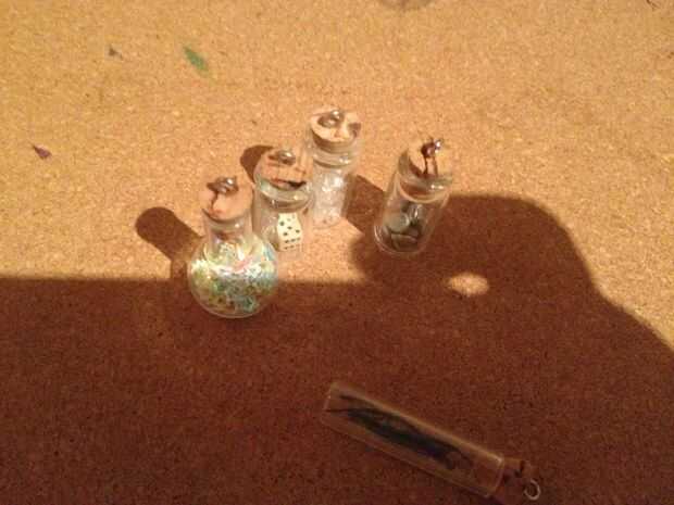 El punto de la pulsera es hacer una pulsera de memoria jar, por lo que en cada uno de sus frascos debe tener algo representativo de sus recuerdos importantes. Usted puede usarlo que quieras; arena, plumas, agua... Lo que sea. Sólo asegúrese de que utilizar un poco de pegamento para mantener el tarro sellado.