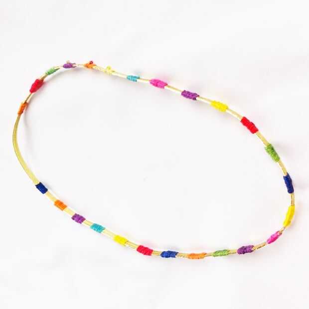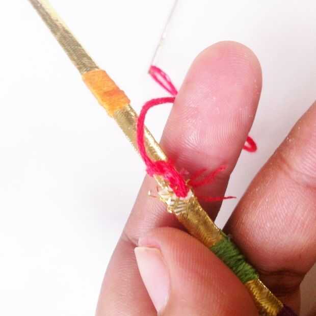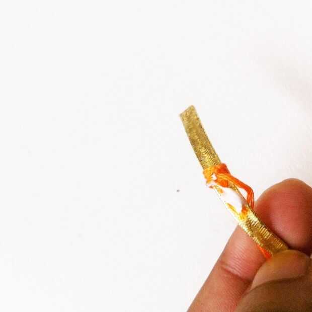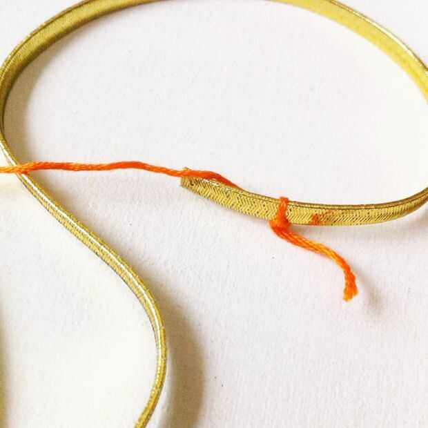 Envuelva el oro elástico alrededor de la cabeza y cortar a la longitud. Tomar una pequeña longitud de hilo de la madeja y un nudo en el elástico.