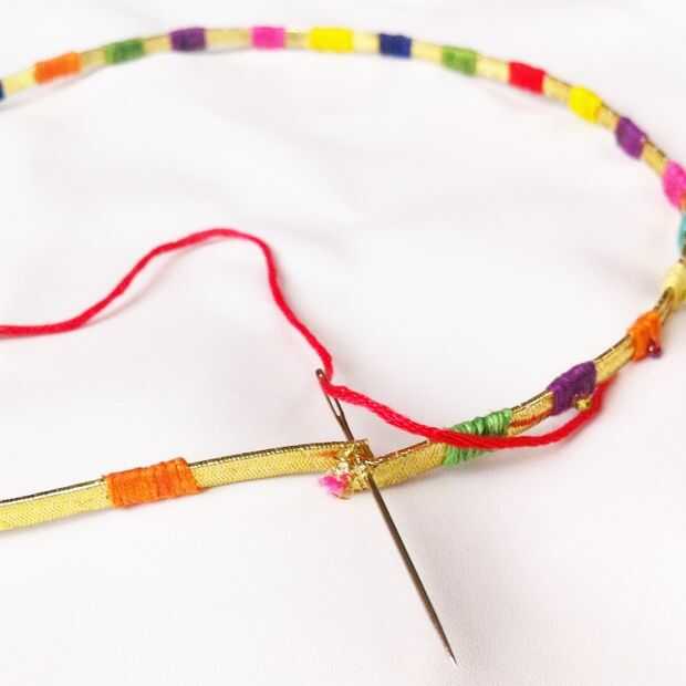 Una vez que haya terminado de envolver su pisada a su alrededor, es hora de unir los extremos. Enhebrar una aguja con el hilo de la madeja. Ambos extremos del pinchazo y unir los extremos. Agregar el pegamento y virar las esquinas por entrando y saliendo con la aguja.