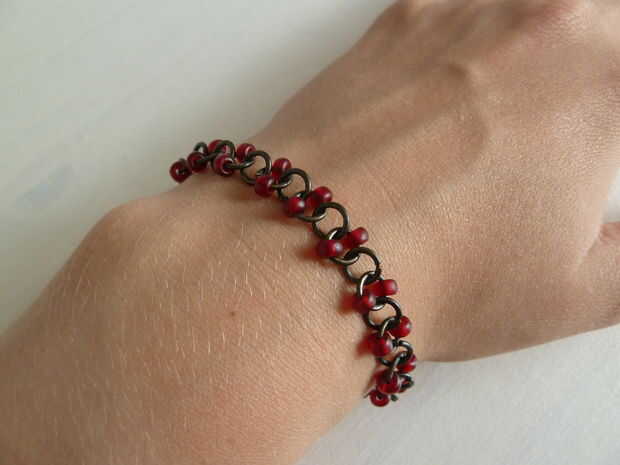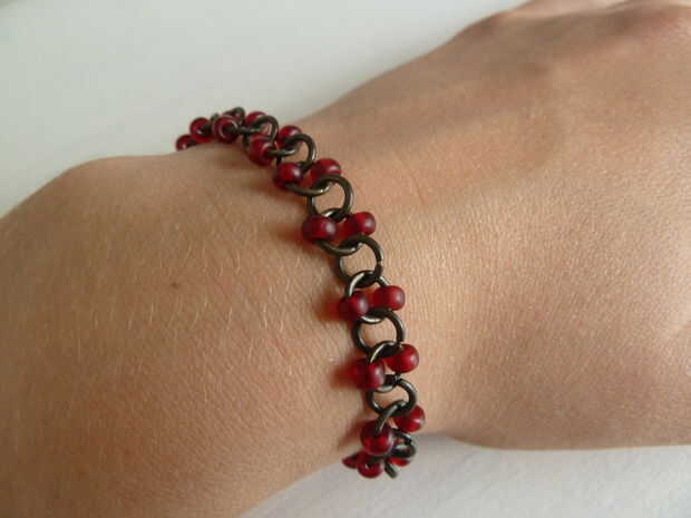 Después de terminar la cadena de mi collar de turner de momento, todavía tenía un montón de esas anillas negro izquierda. Quería hacer una pulsera, un poco en el mismo estilo como mi hogwarts casas pulseras, pero al mismo tiempo totalmente diferente.