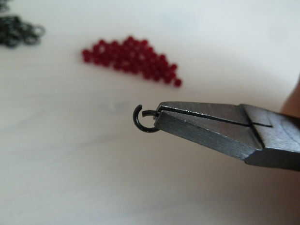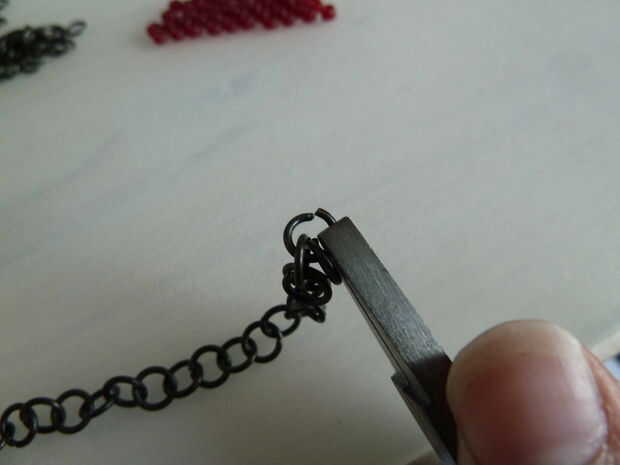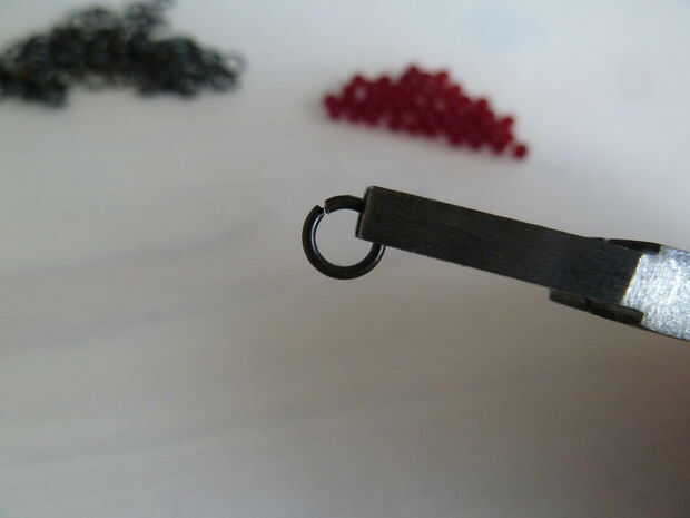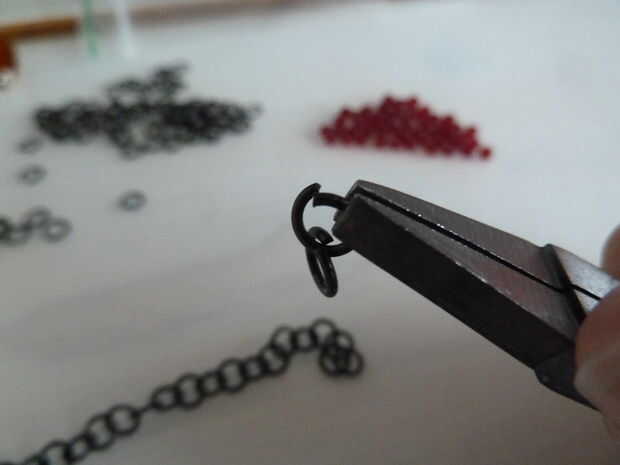 Coloque el primer anillo del salto entre las pinzas y doble abierta con un segundo par de pinzas (con alicates de punta redonda como segunda pareja también trabaja). De esta manera el anillo del salto mantendrá su forma. Añadir un segundo anillo y vuelva a cerrar. Repetir esto hasta que haya alcanzado la longitud deseada. Tenga en cuenta que todavía hay que añadir el cierre.