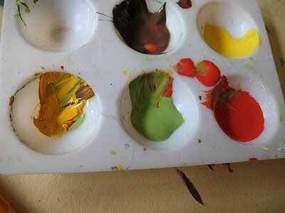 Poner diferentes colores de pintura en una paleta de pintura. Sumerja el pincel en un color, el punto del cepillo en uno o dos colores más para mezclar.