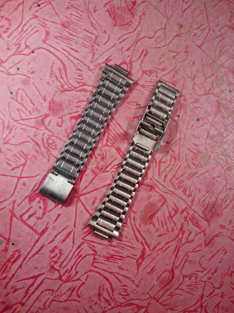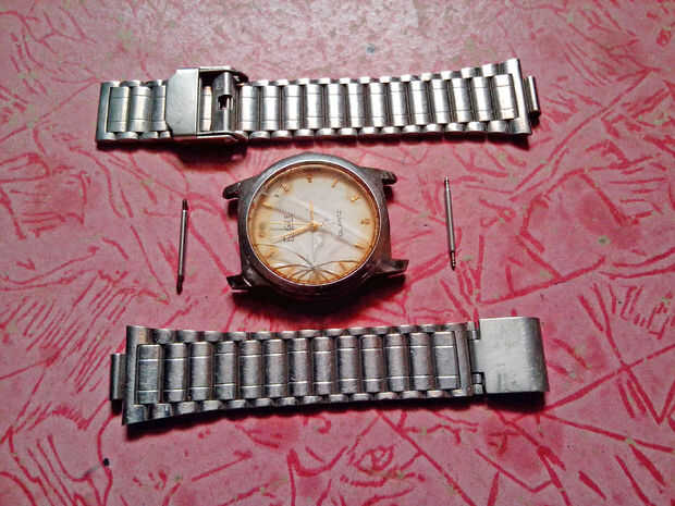 Desmontar el reloj. Se puede hacer con una fuerza bruta o alicate... Sólo Quite los pasadores de conexión el reloj y la correa... Necesitaremos solo las correas para descartar todo, desde el área de trabajo...
