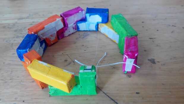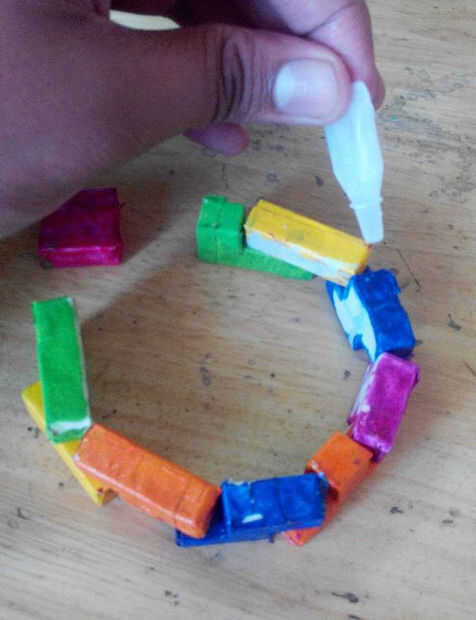 Ahora, coloque los bloques en un patrón circular. Utilice el pegamento para pegarlas juntas donde con a dos cuadras. No olviden que dos dejan un espacio vacío. Finalmente, corta dos trocitos de hilo y colocar uno en cada extremos de los bloques adyacentes a la abertura.