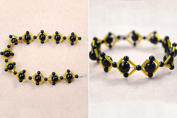 Aquí uso once 8mm negro granos, a continuación, fijar la pulsera rombo cuentas con un grano de la encrespadura; por último Conecte con anillas y broche de langosta.
