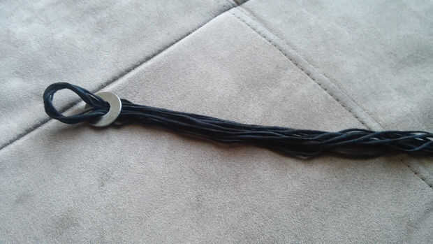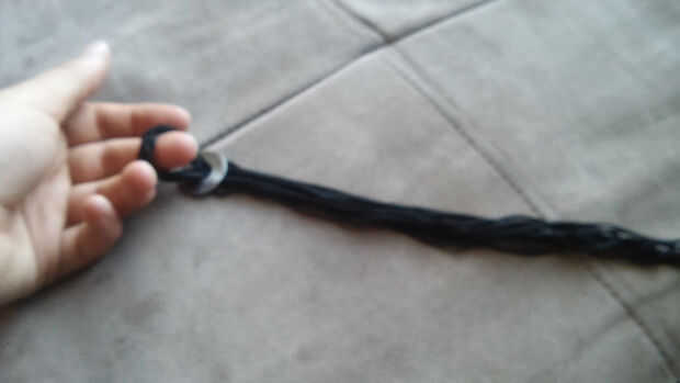 Tomar 6 hebras de hilo y dóblalo por la mitad. Jale el extremo a través del centro de la lavadora y los extremos de los filamentos a través del lazo, ATA fuera del lazo.