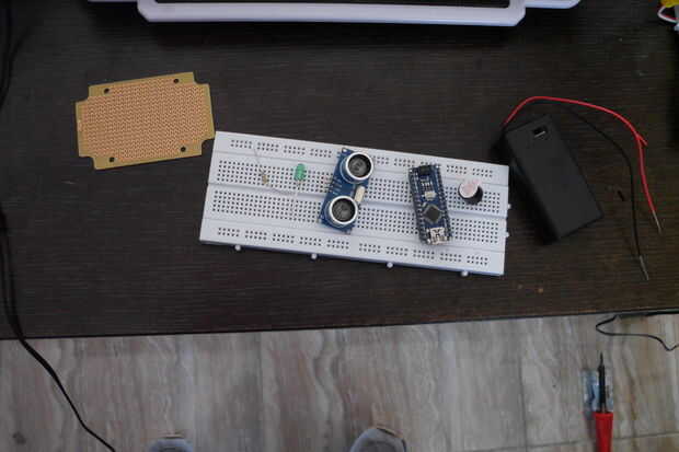 La idea es cuando una persona pone este dispositivo en su muñeca y apunta a cualquier obstáculo dentro de aproximadamente 35 cm va a producir un sonido, de lo contrario será silencioso con un indicador opcional para que si la persona sospecha que su trabajo no podría pedir a alguien si ven luz o no (en caso de que la batería se agote así)
