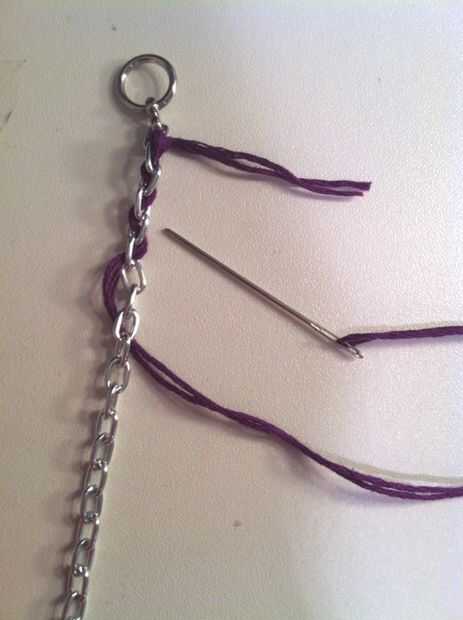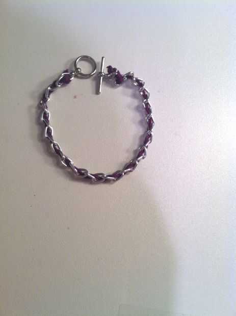 Una cadena plana, con los hilos de colores o cordones de gamuza tejidas a través de cada enlace, ha venido apareciendo aquí y allí en la actualidad. Generalmente nombramos una pulsera cadena y gamuza: pulsera tejida. Aquí, también agregar la cuerda d