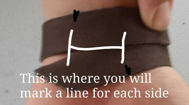 Primero debe medir su muñeca para realizar con precisión una pulsera. Haz tu tira y Envuélvala alrededor de su muñeca para que la piel extra se superpone uniformemente. Luego marque donde hay cerca de 1 pulgada entre las dos correas de cuero. Dichas marcas será el límite de corte el cuero de la trenza.