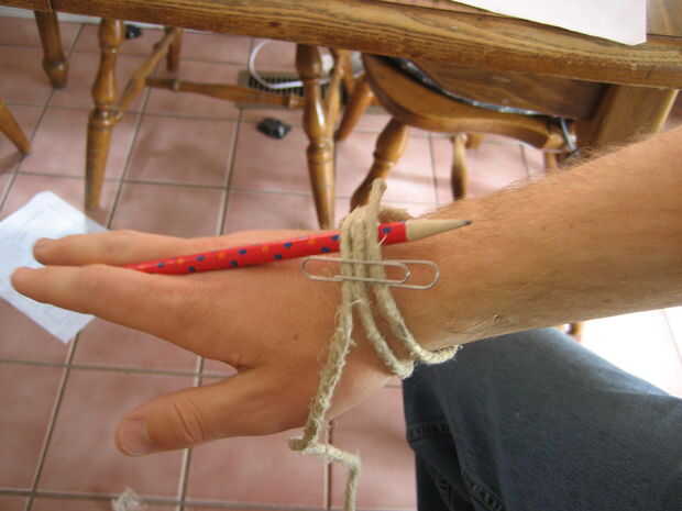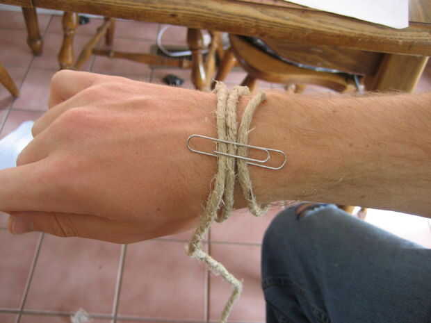 En primer lugar, envuelva la cuerda alrededor de su muñeca 3 veces. Quieres uno corto, extremo suelto en la parte superior de la muñeca y el más extremo suelto colgando hacia abajo entre usted y su muñeca (ver imagen). Clip el clip de papel en tres bucles para que no se mueven. Asegúrese de que los lazos son un poco flojos porque la pulsera apretará un poco como la trenza.