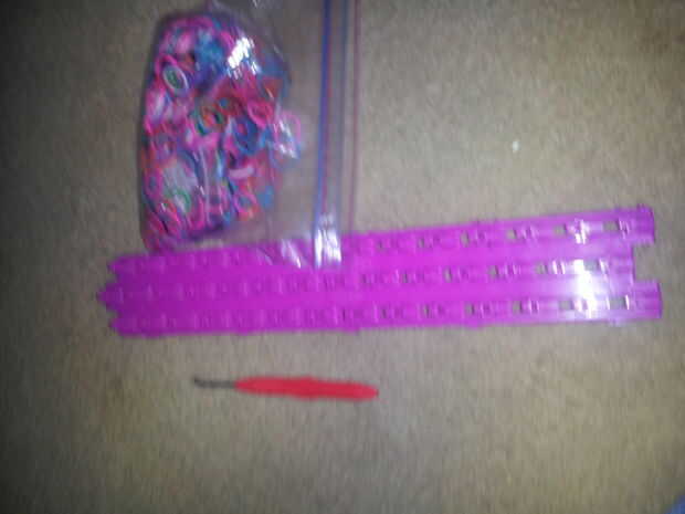 sólo necesitas 13 bandas. Cualquier colorPaso 1: Configuraren primer lugar tomar 1 venda y coloque la clavija 1.Paso 2: Siguiente paso telar debe parecerse a esto. Luego coloque las bandas en las clavijasPaso 3: Iniciar la que se avecina Tome la band