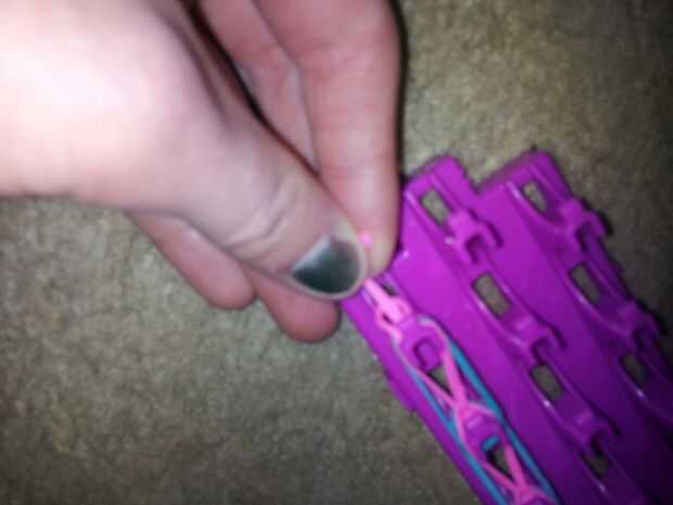 sólo necesitas 13 bandas. Cualquier colorPaso 1: Configuraren primer lugar tomar 1 venda y coloque la clavija 1.Paso 2: Siguiente paso telar debe parecerse a esto. Luego coloque las bandas en las clavijasPaso 3: Iniciar la que se avecina Tome la band