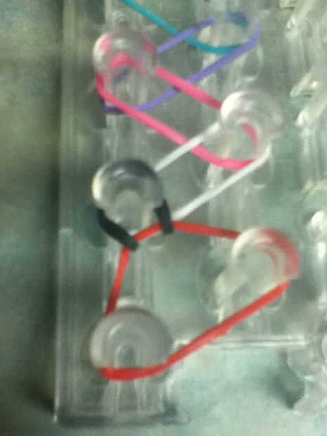 Paso 1: fuentes de Necesita un kit de inicio para el telar del arco iris y algunas elásticas.Paso 2: Colocar las bandas Iniciar colocando un color de borde y no empezar a poner encima de todo lo que tienes que hacer en los patrones.Paso 3: Colocar la