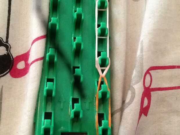 aquí hay un tutorial de una pulsera única triple.Paso 1: materiales Necesita 3 bandas de colores diferentes, su telar y su gancho.Paso 2: Poner las bandas en This step is easy! Simplemente poner las bandas en una fila y al revés por triángulos.Paso 3