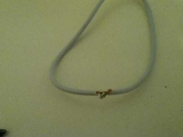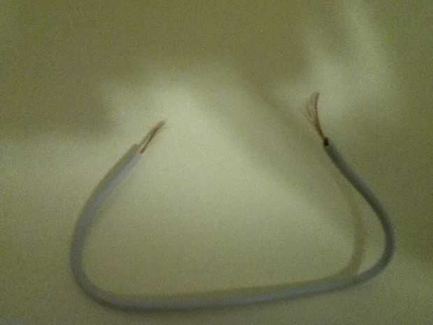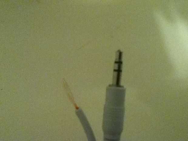 Cortar los extremos del cable.. .mine era un cable de audio no funciona... luego cortar a la longitud necesaria para deslizarse sobre y apagado a mano fácilmente. Luego Pele los extremos y tuerza los cables. Luego de la soldadura de los cables y envolver un trozo de cinta alrededor de la articulación.