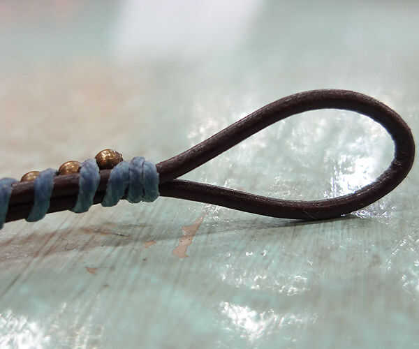 Doblar la longitud de cuero cordones por la mitad para formar un lazo como se muestra. Compruebe el lazo para el ajuste alrededor de su talón. Latigazo de lino encerado todo el cuero de cordón en la base del lazo envolviendo firmemente. Meta el extremo corto de la ropa encerada en su amarre para asegurar la ropa.