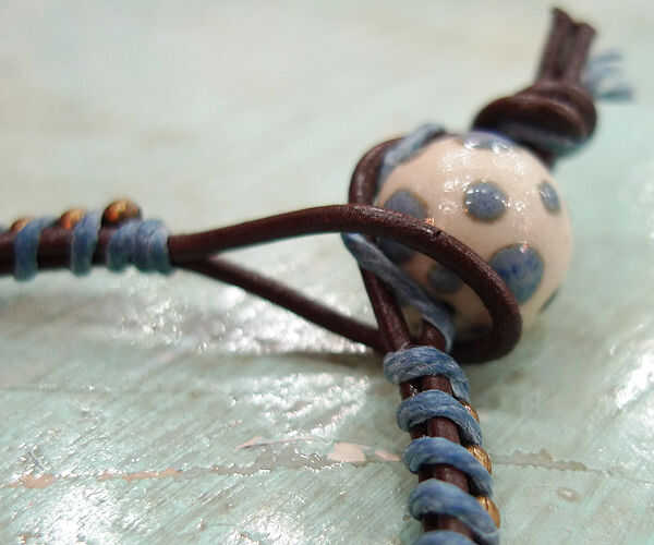Cuando ha llegado al final de la pestaña de cadena de la bola la ropa cordones alrededor de ambos filamentos de cuero 2-3 veces más. Separar las hebras de cuero y un filamento a través del centro de la perla de Pop punto de alimentación. Enrolle el cordón lino alrededor de la otra cadena de cuero. Unir ambos filamentos de la piel y un nudo en dos hilos, como se muestra. Compruebe el ajuste de la pulsera y ajustar en consecuencia. Tire el nudo firmemente y recorte el exceso cuero y lino.