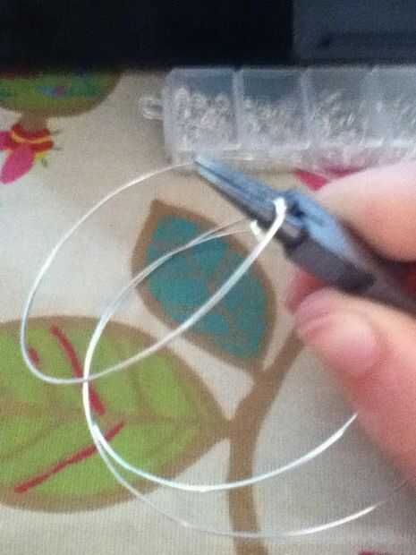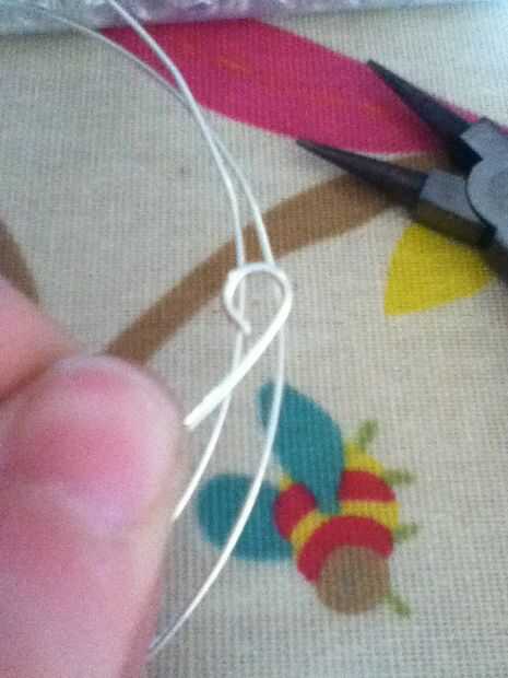 Doble el extremo del hilo en un aro alrededor de los alicates redondos de la nariz, y luego dejar ir y hacer otro lazo con el otro lado. Corte el alambre en el centro donde se cruzan y presione el extremo en a Sobrehilar para arriba si es necesario.