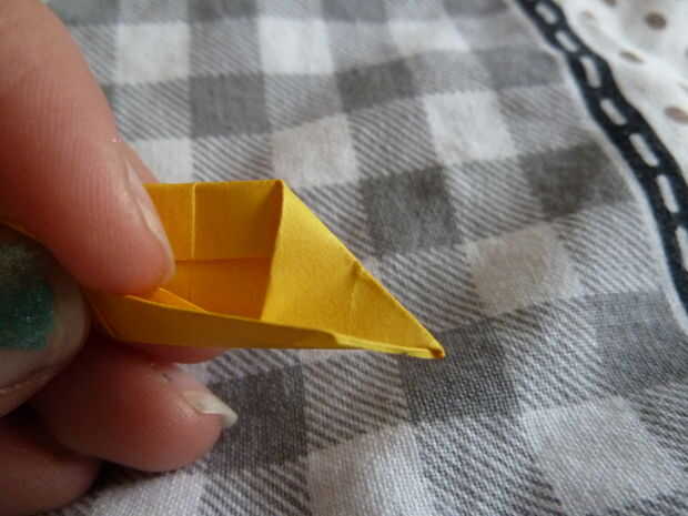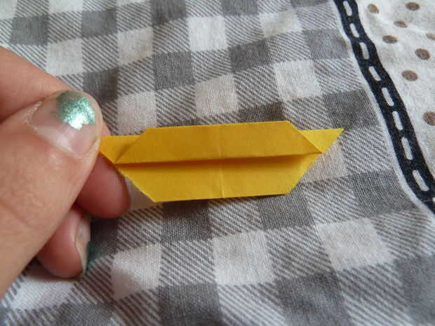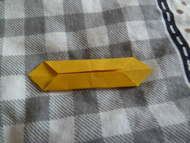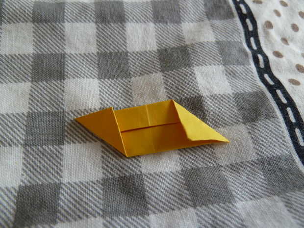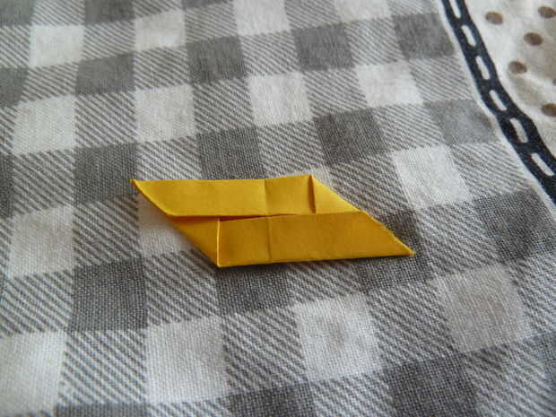 Tome un pedazo cuadrado de papel. Comience doblando el cuadrado por la mitad diagonalmente. Desplegarlo y dóblalo por la mitad otra vez, ahora en la otra diagonal. No se despliegan este redil. Tome la parte inferior y doblar hasta la mitad. Repetir este proceso en el otro lado. A continuación doblar la parte inferior hasta la mitad. Repetir este proceso en el otro lado. Ahora se despliegan el primer doblez diagonal en las esquinas como se muestra arriba. Tomar la esquina superior derecha y doble hacia abajo. Pliegue la esquina inferior izquierda también. Meta en las dos esquinas abriendo el módulo como se muestra arriba.