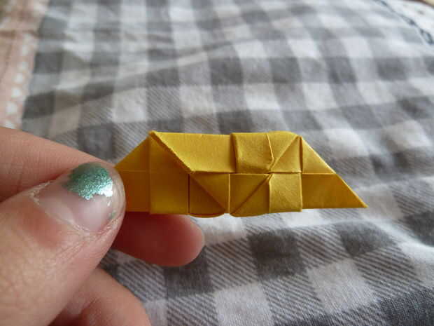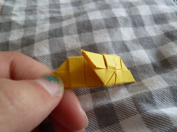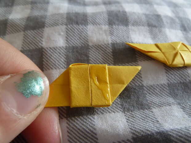 Ahora que se han unido los módulos, usted puede unirse a estos pares para 'construir' su pulsera. Dos parejas se unieron y añadir las esquinas a los bolsillos restantes, como se muestra en las fotos. Es mejor probarlos esto primero, antes de pegar. Una vez que sepa cómo unirse a ellos, tomar su cola. Aplique pegamento a la parte del papel que será cubierto por la esquina. No te preocupes, en la foto también. Repita este paso para la esquina en la parte posterior