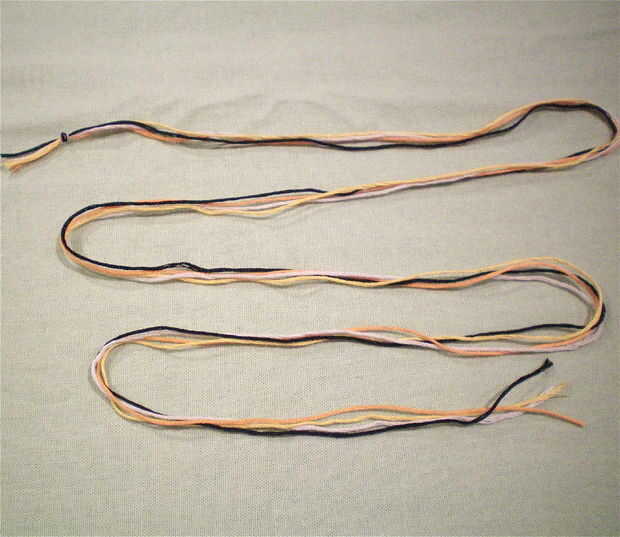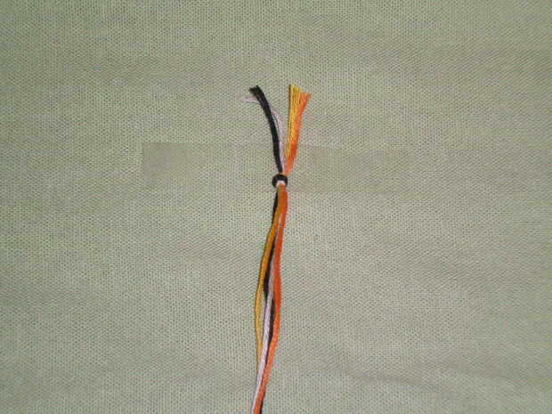 Haga un nudo simple con las cuatro cuerdas para mantenerlos juntos. Hacer el nudo en el extremo de las cuerdas, pero asegúrese de dejar un par de pulgadas gratis pasado el nudo. Esto hará mucho más fácil el atar la pulsera en la muñeca.