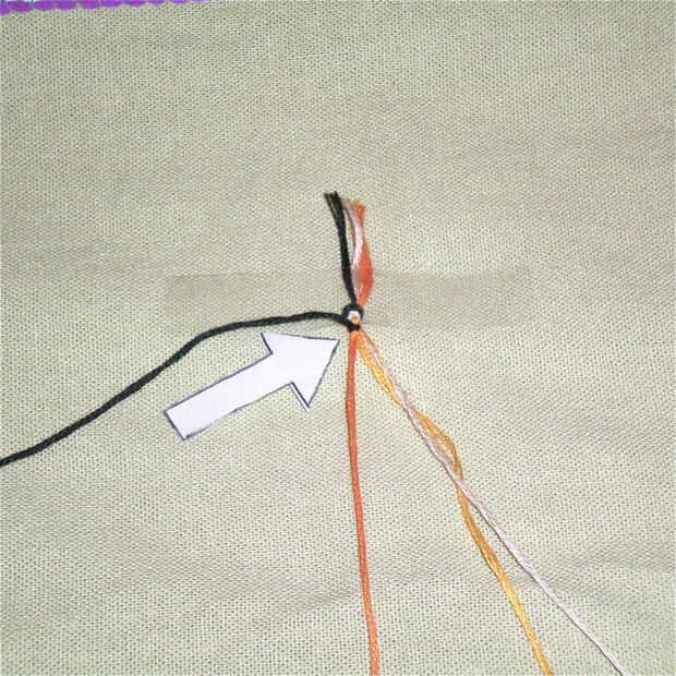 -A continuación, tome la cadena negro en el extremo izquierdo y póngala sobre la siguiente cadena de naranja en un ángulo perpendicular. La cadena negro debe la forma de un «4» sobre la cadena naranja (img 2).