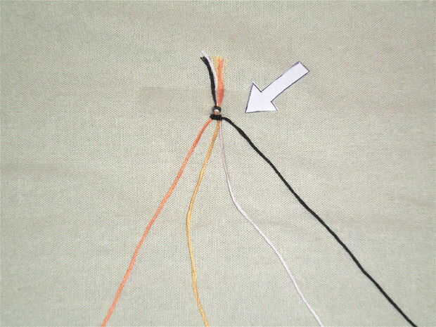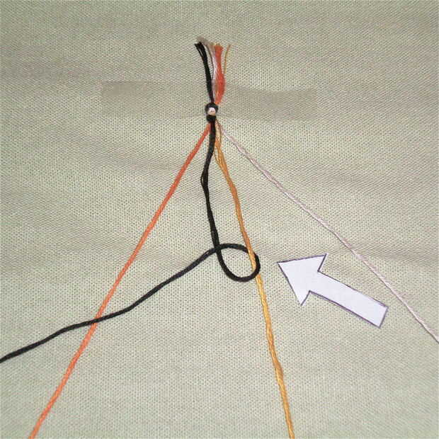 Repetir los movimientos para el paso 3 con la siguiente cadena de colores. Cuando ha atado un nudo alrededor de la cadena amarillo dos veces, pasar a la secuencia blanco. Después de que haya terminado de anudar alrededor de la cuerda blanca, la cadena negro debe estar en el extremo derecho. Una pequeña línea de nudos negros debe ser visible en la parte superior de las cuerdas (img. 3).