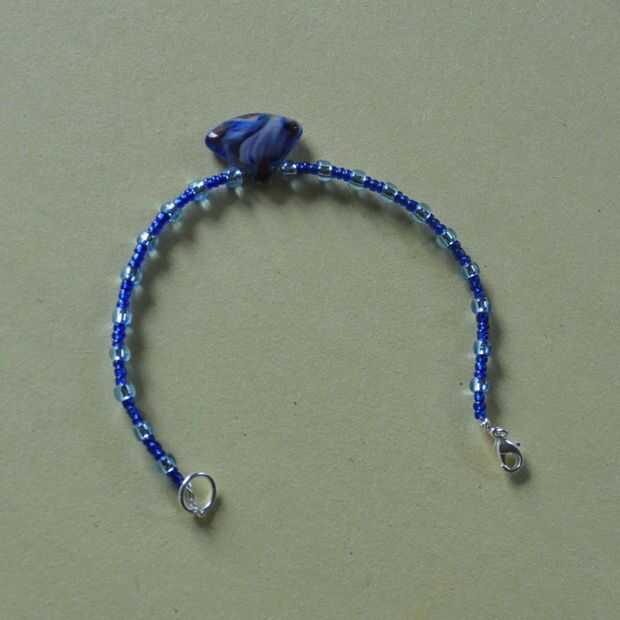 Esta pulsera tiene una repetición del patrón tres granos de 11/0 seguido por granos de un 6/0 con un solo grano grande en el centro.